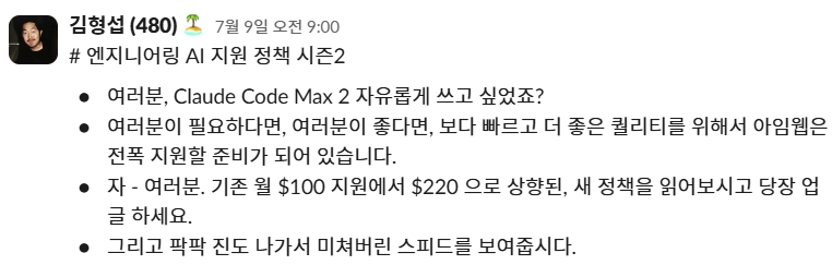 이 변화는 작은 실험에서 출발했습니다. 엔지니어에게 Claude Code Max x20을 먼저 제공했죠. 곧바로 눈에 보이는 개선들이 쌓였습니다. 초안이 빨리 나오니 토론이 간결해지고, 토론이 간결해지니 실행이 붙었습니다. 그 과정에서 우리가 배운 첫 번째 원칙은 기술 그 자체보다 시작의 신호가 더 중요하다는 것이었습니다. “작은 일에도 AI를 써도 된다.” 이 신호를 분명하게 내자, 망설임이 줄었습니다. 누구나 자신의 일을 AI와 함께 시작해 보고, 결과를 팀에 공유하는 흐름이 자연스러워졌습니다.